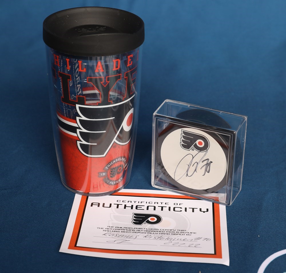 Are you a Flyers Fan? Bid on this autographed puck from defenseman Rasmus Ristolainen to bring a bit of Broad Street home! Also included is a Flyers tumbler!