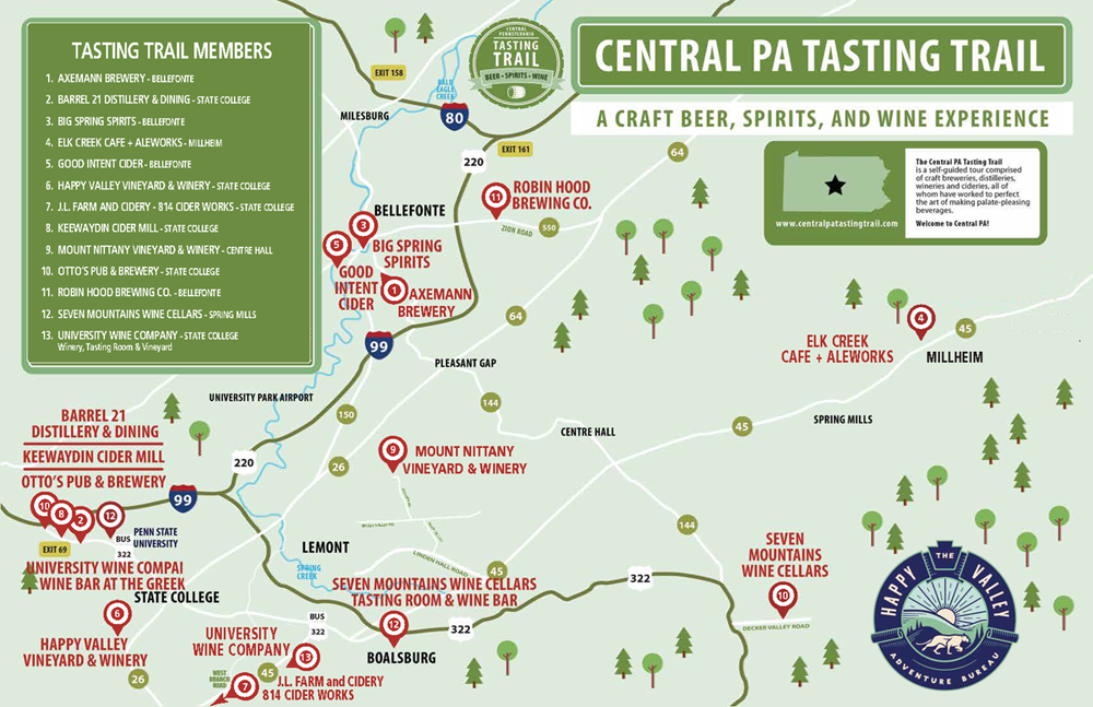 While there may be many alcohol trails to take, our trail offers a sampling of our greatest treasures. 4 family vineyards, 2 cideries, 3 breweries, & 2 distilleries offer opportunities few if any trail can compete with. Must be 21 years of age. Take your time and stop at each of distinct members locations Get your stamp, your unique sampling, and possibly a little memento Complete your pass and - bring to the HAPPY VALLEY ADVENTURE BUREAU (800 E. Park Ave, State College, PA 16801) and we will get the sweatshirt out to you in just a few weeks. OR…. stop into Big Springs Distillery (198 Match Factory Place, Bellefonte, PA 16823).